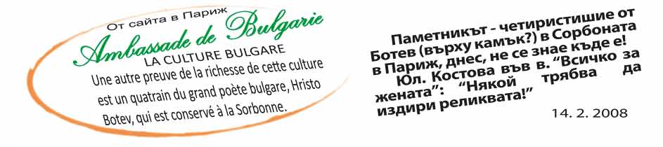 "Le réveil a sonné en 1762, avec le moine Païsiy qui écrit « Histoire des Slaves bulgares ». Ce manuscrit, recopié avec piété, a provoqué une prise de conscience nationale, qui s'est exprimée dans la littérature d'inspiration patriotique des écrivains de la Renaissance bulgare, avec Petko Slaveykov (1827-1895), Luben Karavelov (1834-1879) et Hristo Botev (1848-1876), dont un quatrain est conservé à la Sorbonne." |