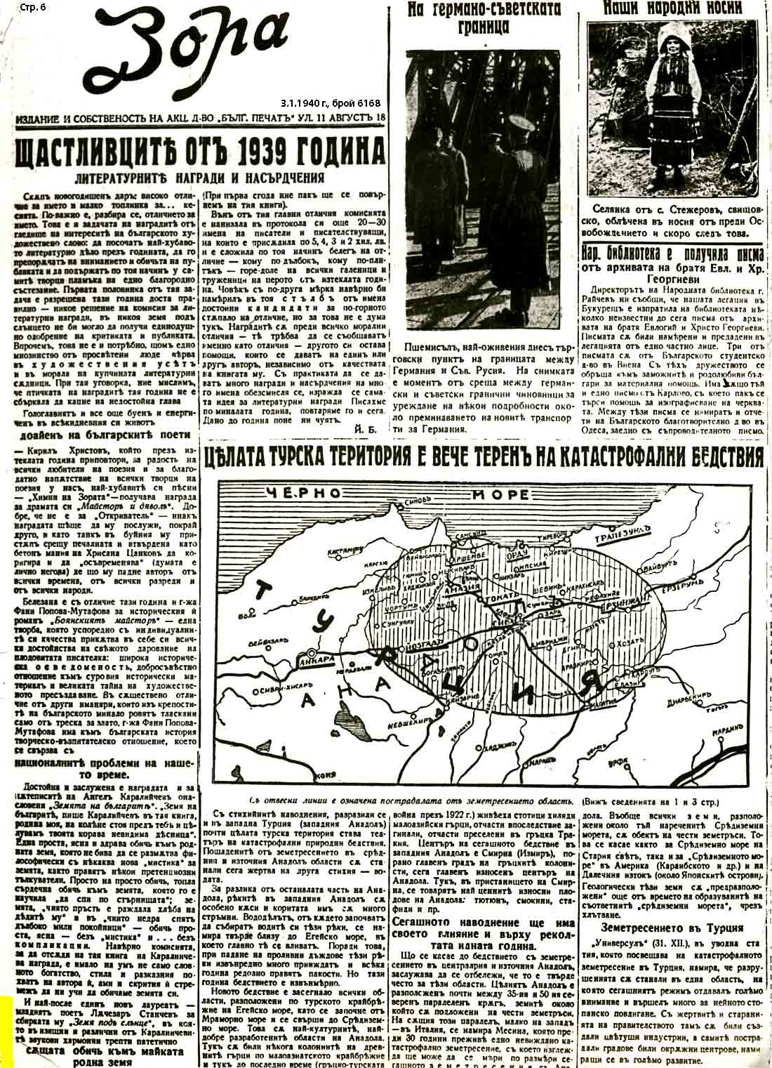 Скъп новогодишенъ даръ високо отличие за името и малко топлинка за ... кесията. По-важно е « разбира се» отличието за името» Това е и задачата на наградитъ отъ гледище на интересите на българското художествено слово: да посочатъ най-хубавото литературно дело презъ годината» да го препоръчать на вниманието и обичъта на публиката и да подържатъ по тоя начннъ у самитЬ творци пламъка на едно благородно състезание. Първата половинка отъ тая задача е разрешена тази година доста правилно — никое решение на комисия за литературни награди, въ никоя земя подъ слънцето не би могло да получи единодушно одобрение на критиката и публиката. Впрочеиъ, това не е и потръбно. шомъ едно мнозинство отъ просветени люде първа въ художествения усетъ и въ "морала на купчината литературни ежлници. При тая уговорка, ние мислимъ. че птичката на наградигъ тая година не е сбъркала да капне на нелостолна глава Гологлавиятъ и все оше буенъ и енергиченъ въ всекидневния си животъ доайенъ на българските поети — Кирилъ Христовъ. която презъ изтеклата година приповтори, «I радость на всички любители на поезия и за благодатно напжтетвне на всички творци на поезия у насъ. най-хубавитъ си пъхни — .Химии на Зората — получава награда за драмата сн Мапсторь и дявол. Добре, че ис е за .Откриватсль' — инакъ наградата шъпхе да му послужи, покрай друго, и като танкъ въ буйния му при-стлчпъ срешу печалната и втвърдена като бетонъ мания на Хрмсана Цанкопъ да коригира и ха .осъвременява" (думата е лично негова) де шо му падне авторъ отъ всички времена, отть всички разреди и отъ всички народи. Велезана е съ отличие тази година и г-жа Фани Попова-Мутафова за историческия й романъ Боянскиять майстор — една творба, която успоредно съ индивидуалнитЪ си качества прикжтва въ себе си венч-кн достойнства на свежото дарование на плодовитата писателка: широка историческа о е в е доиеность, добросъвт.стно отношение къмъ суровия исторически ма-териалл» и великата таЛна на художествс-иото пресъзда влне. Въ сжшествено отли-*гне отъ други нманярн, които изъ крепости-ТЬ на българското минало ропятъ тласкани само отъ треска за ял а то. г-жа Фяпи Попова-Мутафова има къмъ българската история творческо-възпитателско откошение, което се свързва с националните проблеми на нашето време. Достойна в заслужена е наградата и за пътеписите на Ангелъ Каралийчевъ онасловен Земята на българите. Земя на българите пише Каралийчевъ въ тая книга, родино моя, на колене стоя предъ тебь и целувам твоята корава невидима десница. Една проста ясна и здрава обичь къмъ родната земя, която не бива да се разглежда философски съ някаква нова .мистика за земята, както правятъ някои претенциозни тълкуватели. Просто на просто обичь, топла сърдечна обичь къмъ земята, която го е научила "да спи по стърнищата"; земята чиято пръсть е раждала хлъба на дедите му и в чиито недра спят дълбоко мили покойници — обичь проста, ясна — безъ «мистика" и ... безъ компликации. Навърно комисията, за да отсъди на тая книга на Каралийчева награда е имала на умъ не само словесното богатство, стил и раказния похват на автора й, ами и скрития й стремеж да ни учи да обичаме земята си. И най-после единъ новъ лауреатъ — мдадиятъ поетъ Лъчезаръ Станчевъ за сбирката му "Земя подъ слънце". въ която въ изящни и различни отъ Каралийчевите звукови хармонии трепти пате